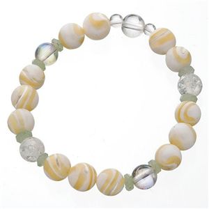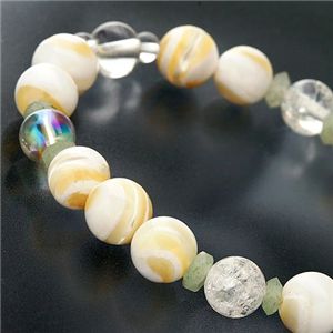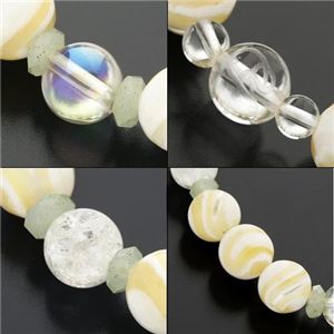 純粋無垢のヒーリング石といわれる「オーラクオーツ」。気の流れを調整し、災難から身を守ってくれるといわれる「クラック水晶」など、マザーオブパールのパワーをさらに高める水晶たちをミックス。柔和な色合いと、澄んだ輝きが混ざり合い、清楚で可憐でしっとりと色香が漂うブレスに仕上がりました。